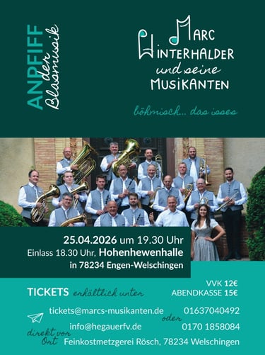 Hier finden Sie unsere anstehenden Termine. Besuchen Sie uns live und erleben Sie die Musikanten unter der Leitung von Marc Winterhalder hautnah!